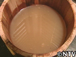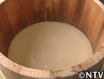 樽のまま動かさずに放置すれば、比重の重いデンプンは軽いゴミと分離し底に溜まる。ここから3日間デンプンが水中で沈殿するのを待つ。 |