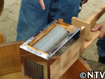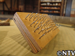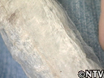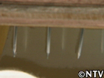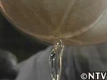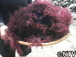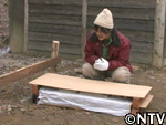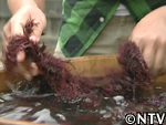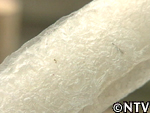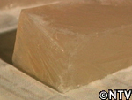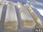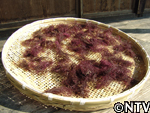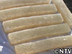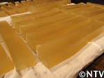 | 2009年 3月 乾燥 風通しの良いところで4、5日寒天を乾燥させ、ほとんどの寒天は水分が抜けたけれど、その中にも水が抜けず、柔らかい状態で残っている部分があった。 柔らかい部分は、腐りやすくなるということもあり、腐敗防止のためにやむなく切除した。全部で26本の寒天が完成し、あとは夏を待つばかり。 |