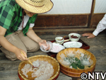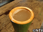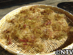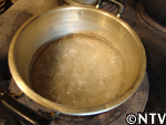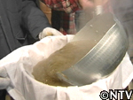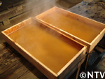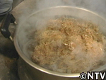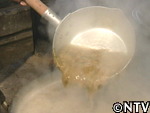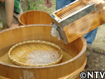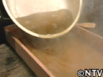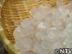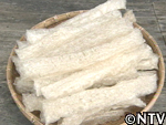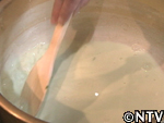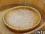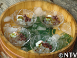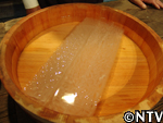 | 【寒天】 材料:棒寒天…3本/水…1.5L @棒寒天を30分以上浸水させる。細かいゴミを出すようにすこし揉む。 A細かくちぎって鍋に入れ水から煮る。 B沸騰して15分経ったら、弱火にして静かに煮溶かす。 C竹筒に流しこみ、冷やして固める。 D固まったら寒天用「天突き」で出す。 |