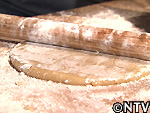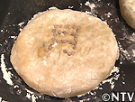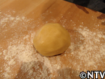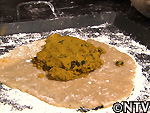 | B成形する 丸めた生地を麺台で薄くのばし、餡をその上にのせて包む。 |