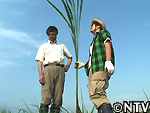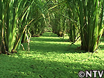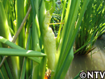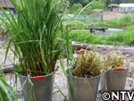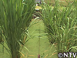 | 2008年6月 生長様子見 空梅雨で晴れ間が多かった一昨年の6月は葉が大幅に伸びた。明雄さんから分けて頂き、一緒に栽培していた食用のマコモは生長が早く、二週間で95cmにまで達する勢いだった。食用のマコモは、マコモズミを採取するマコモと同じ植物だが、食用に黒穂菌の繁殖が少ない株を選別した栽培用の品種。 |