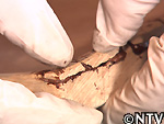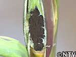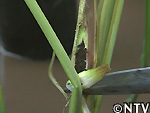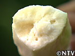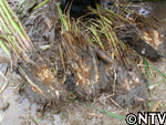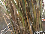 | 2008年10月 野生種マコモ様子見 生長の遅れていた野生種のマコモは葉が枯れ始め、これが枯れきる頃に収穫する。膨らみ始めたマコモを切り、断片を見てみると黒い粉状の物が。野生種マコモの生長も進んでいるようなので、もう少し様子を見る事にした。 |