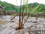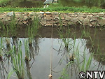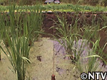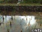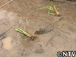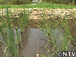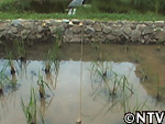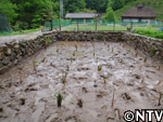 | 2008年5月 定植 株分けして頂いたマコモを定植する。場所は田んぼの南側、ぬかるんだ土壌を利用する為、かつてレンコンを植えた池に植える。マコモを栽培する上で、最も気をつけなければいけない事は水温管理。黒穂菌の活動が活発となる15〜25℃を目安に水温を保つようする。 |
