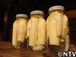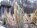 | 2008年12月 収穫 野生種マコモは完全に枯れきり、いよいよ収穫。収穫した野生種マコモは合計18本。これを概ね半年間は乾燥させ、水分を完全に抜くとマコモズミが粒子の細かい胞子状態になり、無駄なく採取出来る。お盆づくりの準備も進めつつ気長に乾燥を待つことに。 |