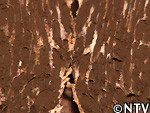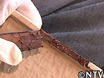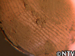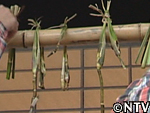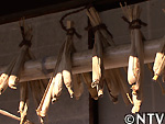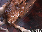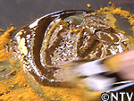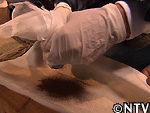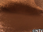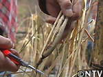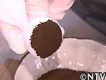 | 工程@ マコモズミの乾燥確認 野生種のマコモを収穫して1年が経過した2009年の11月、じっくり乾燥させたマコモの中を見てみると、完全に水分が抜け茶色く粒子の細かいマコモズミが。マコモズミを採取する準備が整ったので、いよいよ茶盆作りが始まった。 |