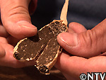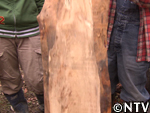 工程A 木地探し 塗り箸でもお世話になった漆職人の秋葉さんにご指導頂き、村の廃材で適した木材を探す。秋葉さんが薦めてくれた木材はトチノキ。トチノキは材質が均等で乾燥しても変形が少なく、木地を加工しやすいそうなので、トチノキでお盆を作る事にした。 |