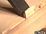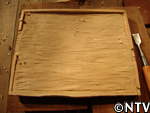 | 工程B 木地加工 一般的な給仕盆サイズの30cmを目安にトチノキを切り、縁を5mmの幅で残し、1cm程の深さになるよう内側を彫り削る。しかし、5mm幅の縁を残し掘り進めるのはなかなかの至難の業。少し力を入れ過ぎ縁までも削り落としてしまった。 |