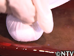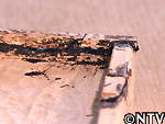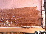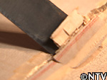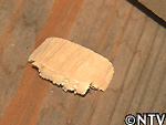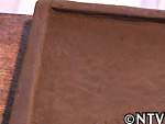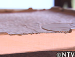 | 工程C 修復-米粉漆 削ってしまった縁は修復が可能。男米のクズ米を利用し糊にして漆と混ぜると米のデンプン質が強力な接着剤になる。米粉漆ができあがり、たっぷりと塗り、押し固める。こうする事で漆がさらに木地に吸われるので強度が増し補強される。 |