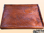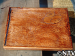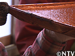 | 工程H すり漆 ツヤ出しと補強を兼ねた仕上げに拭き漆を施す。磨き上げたマコモズミの上から漆を一塗りすると光沢と共に深みも増し、村オリジナルの特製茶盆が完成した。 |