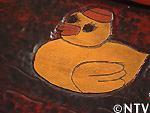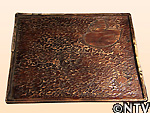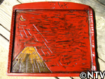 | 工程G マコモズミの磨き 乾かす事一週間。乾燥したお盆はさらに黒みを増していた。これを磨き砂で磨けばあの独特な陰影が出て来るはず。 丁寧にマコモを擦り削っていくと無事あの陰影が浮き出て来た。 |