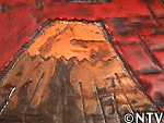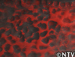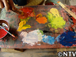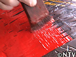 | 工程E 色漆 酸化鉄などの鉱物の原料に漆を混ぜ、色漆を作り、3回目の下地塗りで使用する。色漆には本朱、ベンガラ、山吹、レモンイエロー、コバルト、緑、白などの色がある。鎌倉彫は中心の色が朱色になるので、朱色を軸に色漆を使用すればマコモズミが際立つ。 |