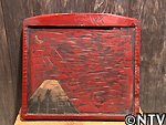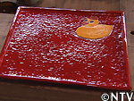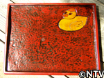| 鎌倉彫 カツラやイチョウなどの木を用いて生地を形成し、書きこんだ線の外側を彫刻刀で落とし文様を浮き上がらせ、文様以外の部分には各種の刀を使い刀痕(とうこん)をつける。木漆を生地にしみ込ませ、研ぎを施しながら漆を塗り重ねていき下地を作る。下地となる漆の乾燥を見極め、マコモズミを塗り陰影をつけ、磨き上げれば朱塗りの一種で、日の丸の色である本朱のお盆になる。 |