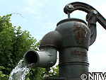 手押しポンプ ハンドルを手で上げ下げして水を汲み取るもの。 江戸時代に灌漑用として伝わる。明治時代中期以降、政府は、開放型井戸の汚染によるコレラなどの伝染病拡大を懸念し、密閉型手押しポンプへの改善を勧めていき、やがて各地に広まった。 |