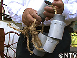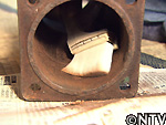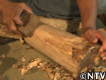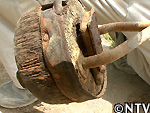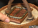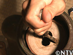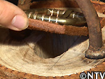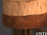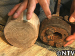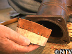 | 2010月8月 ピストン修復 続き 頂いた厚さ5mmのベルトに合わせ、木玉の巻皮取り付け部分を削る。シリンダーと木玉を密着させなくてはならないミリ単位の作業のため、相当な時間がかかった。ある程度削り進めたら、巻皮を木玉に固定しシリンダーとの密着具合を確かめる、の繰り返し。 |