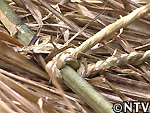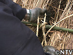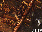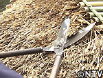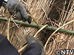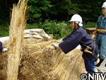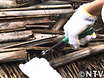 | 工程C 茅の固定 敷き詰めた茅を押しぼこで固定し、玉縄で骨組みに結びつける。この時、玉縄を持った手を針のように茅の絨毯に突き刺して骨組みに通す。最後に、結んだら解けないという「とっくりしばり」で留める。最終チェックは、家の中から。茅の葺き方が甘いと再び雨漏りしかねないので、入念にチェックした。 |