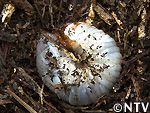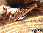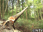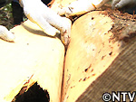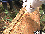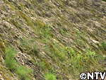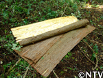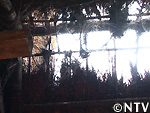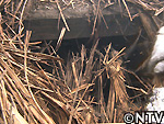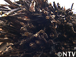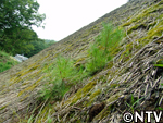 | 茅葺き屋根の点検 雨漏りの具合を屋根に上がり確認してみると、屋根の表面が腐敗し、それを肥やしに松が生え、幼虫が孵っていた。現状を確認し、話し合った結果、茅葺き屋根の補修を決行する事にした。しかし、修復といっても時間がかかるので、とりあえず秋の台風に備え、すでに雨漏りしている大棟の修復から始める事にした。 |