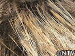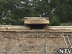 | 工程B 新旧の茅を交互に4層重ね合わせる 丈夫な古茅の上に切り揃えた真新しい茅を敷き詰める。更に、その上に古茅を敷き、最後に再び新しい茅を敷く。こうする事で、茅を節約しつつも、全て葺き替えた時と同じ強度を保つ事が出来る。 |