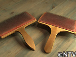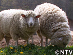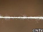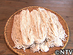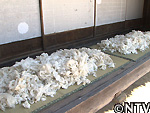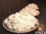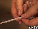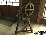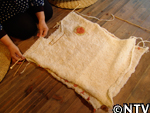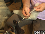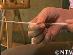 | 2010年9月 双糸づくり セーターづくりに必要な1400mほどの糸づくりが完了した。しかし、出来上がった糸は単糸と言われる細い糸。単糸は主に織物などに使用するが、今回はセーターを編むので保温性に優れ、仕上がりが均一に綺麗に仕上がるという双糸にする。 双糸は単糸を二本撚り合わせる為、足踏み糸車を逆回転させてつくる。 |