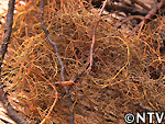 | 材料採取 双糸が出来たら、デッサンを元に糸を染める。 先生によると村に自生する植物で様々な色が出せるそうなので、先生と里山を探索する事にした。 メンバー4人で考えたデッサン通りのセーターを作るには白の毛糸以外に赤、黄色、緑が必要。赤を出す植物は少ないそうだが、染料として太古から使用されていたというニホンアカネが自生していた。真っ赤な夕焼けを茜色と表現する事があるが、これはこのアカネが語源で、夕日のような真っ赤な色に染まるそうだ。 |
