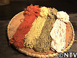 | 媒染 媒染とは、繊維にあらかじめ金属性の物質を浸透させることにより、後から入れた色素とイオン結合させ、それだけでは浸透しにくい色素を定着させる。媒染する事により、色が抜けにくくなるだけではなく、より鮮やかな発色を促す。同じ染料でも媒染剤が違うと色素と繊維のイオン結合の仕方が変わるので全く違う色に染まる。 羊毛の場合、「無媒染」というわざと媒染しない場合もあるが、色が薄く、時間が経つと色が抜けてしまう事がある。染料する前に媒染する「先媒染」と染色した後に媒染する「後媒染」があり、使用する草木や出したい色によって使い分ける。 今回、村ではサザンカのアルミニウム成分を抽出したものと鉄から抽出した媒染剤を使用した。 まず、サザンカの灰から抽出したアルミニウムでアルミ媒染をした毛糸から 赤、黄色を染め、より鮮やかな色を出した。さらに緑は、黄色に染めた後に鉄から抽出した媒染剤を使用する事により渋めの緑を出す事が出来た。こうして、どの色も草木染め独特の渋く奥深い色になった。 |