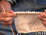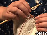 | 編み始めたが、メンバー全員、編み物の初心者。何も分からなかったけれど、先生が丁寧に教えてくれたので、複雑な編み方を徐々に理解出来るようになった。同じ作業の繰り返しが続くので、慣れるとみんな無心で編んでいた。けれど、無心になり過ぎて、「今、何目編んだか?」とか「これっ表編みだっけ?裏編みだっけ?」などと基本的な事まで分からなくなる事がよくあった。僕がお手伝いした袖の部分は白一色のメリヤス編みのみだったが、達也さんが担当する後ろ身ごろは「40」という赤色で模様が入るので、色も変わるし、目数・段数を細かく気にしなければならないので難易度がグンと上がる。何でも器用にこなす達也さんが、今回はかなり苦戦していた。 |