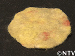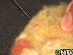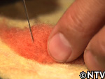 | 太一さんが担当する前身ごろには、フェルトで作る唇のワッペンがワンポイントでつく。フェルトとは、羊毛を専用のニードル針で絡ませる事によって不織布にして作る。立体的にも作れるので、粘土のように、造形しやすくすごく楽しそうだった。出来上がった唇のフェルトワッペンは本当にかわいらしかった。特に、3色の羊毛を混ぜ合わせた下地には太一さんのセンスの良さを感じた。 |
