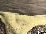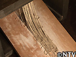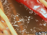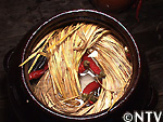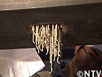 茹で 麺を押し出せたらすぐに熱湯に入れ、茹でる。グルテンがないので麺線を長く保てず少しでも時間が経ってしまうと細切れ状態になってしまう。 茹でる時間は一分間。これ以上茹でてしまうと、今度は水分量が多くなり伸びてしまう。 |