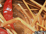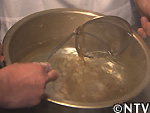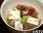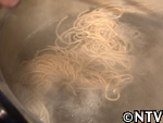 | 冷却 一分間茹でた麺はすぐに取り出し、冷水に浸ける。こうする事により、麺が固まり引き締まる。これでようやく冷麺の麺が完成した。 |