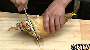 穂先を切り落とし、中身が切れないギリギリのところまで包丁で切り込みを入れておくと、火の通りも良くなり、あとで簡単に皮を向く事が出来る。