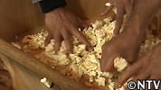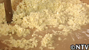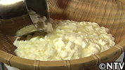 3. 固まったら(レンネット添加から約30分後)、細の目状に切り、チーズの素となる固まりと水分(ホエー)を分ける。