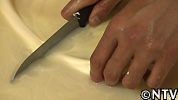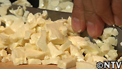 4. 1時間ほど待ち、チーズの素となる固まりを包丁で細かく切る。