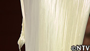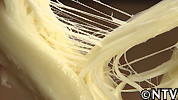 6. チーズの素の固まりを手で棒状にひっぱって伸ばす。