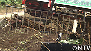 ごぼう収穫機(堀り取り機)を使う。二枚の刃が、地中にもぐってごぼうを土ごと堀りあげる仕組み。そのごぼうを、ベルトがはさんで抜き上げる。抜き上げられて、カゴに一定量たまると自動的に、ごぼうの束が落ちるようになっている。