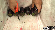(カゴに入れた時や選別の際に)水なすを傷つけないよう、水なすのヘタは短く切る。