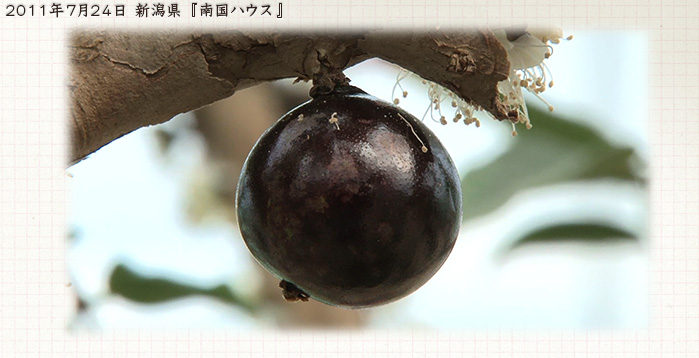 - 木の幹に直接、白い花が咲き、その後、大きさ・色・味ともに巨峰によく似た実がなる。