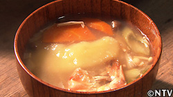 - ニンジン、ネギなどが入ったエビの出し汁に落とす。
