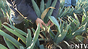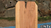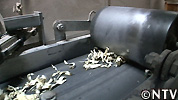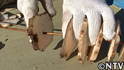 V字型の切り目が入っている板で、乾燥したこんにゃく芋を外す。