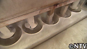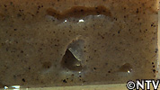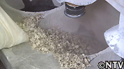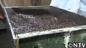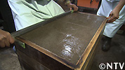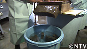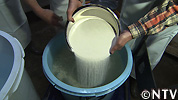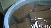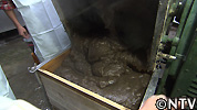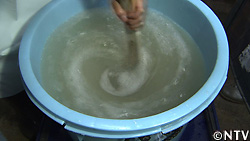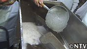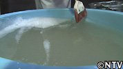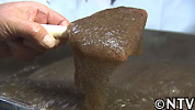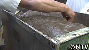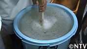 ④石灰230gをお湯に溶いた凝固剤を加え、1分間撹拌し、枠に流し込む。石灰を加えた後は5秒長くても短く