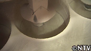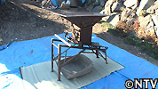 →杵に板状のもの(あおり板)が取り付けられ、搗きながら臼の中を扇ぐ。これによって、飛粉が巻き上げられて取り除かれ、臼には精粉(コンニャクマンナン)だけが残る。