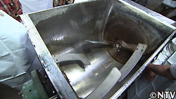 ②バタ練り機にお湯を入れる。色づけ用の海藻粉末を入れ、混ぜる。