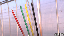 これらの色が塗られた割り箸を目印に、その特性が出た株に挿す。この割り箸が5本立てば品種登録し、商品化される可能性が高い。しかし、5本立つ事は滅多にない。
