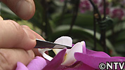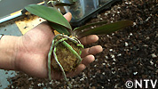 ずい柱(雄しべと雌しべが合体した部分)に花粉塊があり、その下に花粉つけて交配させる。