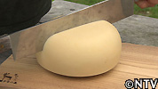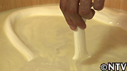 - チーズの素の固まりを手で棒状にひっぱって伸ばす。