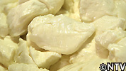 - チーズの素となる固まりに85℃のお湯を入れ、すりこぎと木べらで混ぜて、伸ばしても切れない繊維と弾力が出るまで練る。(手でぎゅっとしめて、引きちぎるとモッツアレラチーズの完成)