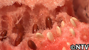 - おつきさまスイカの次に品種改良に取り組んでいるのは、果実も種も赤い「種あかし」。