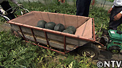 - 収穫したスイカは、柳さん手作りの運搬機に乗せて軽トラックまで運ぶ。