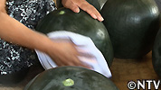 おつきさまスイカは黒皮のため、ブルームが目立ってしまい、農薬や汚れに間違われてしまうこともあるので、濡れ布巾でよく拭き取る。贈答用としてふさわしいようにするためでもある。