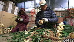 収穫した白玉ねぎは一旦畑に置いて、風を当てて乾かす。これを「風乾」といい、こうすると、砂が直ぐに取れる。