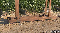 村松さんは、お手製のマルチに等間隔に穴を空ける道具を持っている。