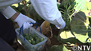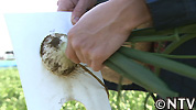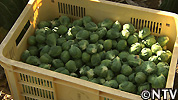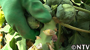 葉っぱが対称に重なっているものが良いもので、実の下の葉を取らないと、上手く収穫ができない収穫は機械では出来ないため、すべて手作業で行う。